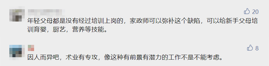 許多網(wǎng)友表示理解:“像這種有前景有潛力的工作不是不能考慮?!薄凹艺熆梢越o新手父母培訓(xùn)育嬰,廚藝,營(yíng)養(yǎng)等技能。
