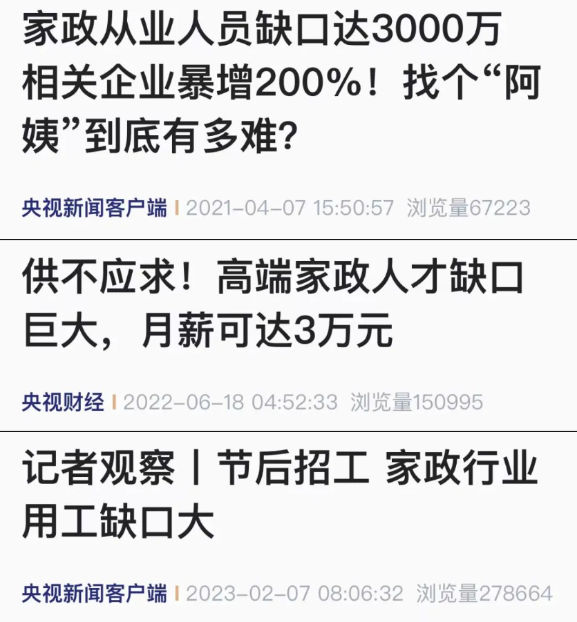 近年來(lái),輿論對(duì)于高學(xué)歷人員從事家政行業(yè)的新聞褒貶不一,但關(guān)于家政從業(yè)人員缺口的報(bào)道卻是層出不窮。